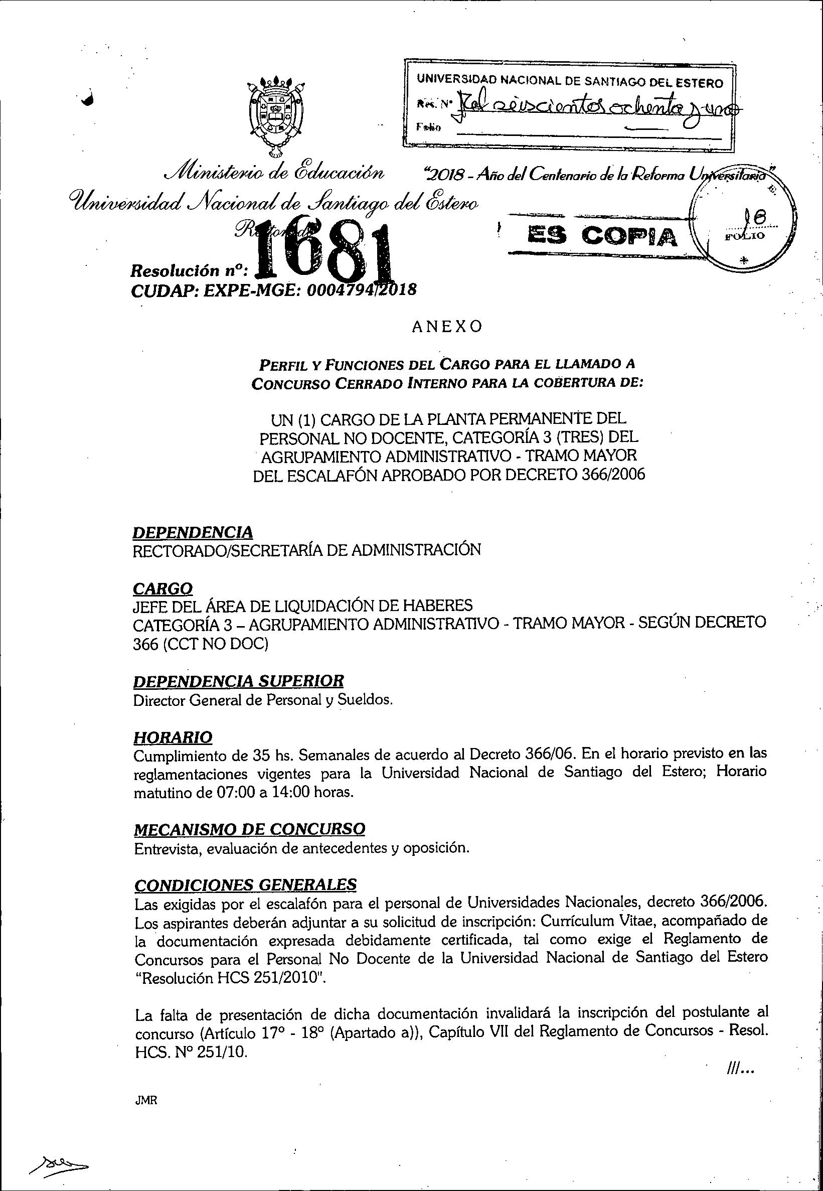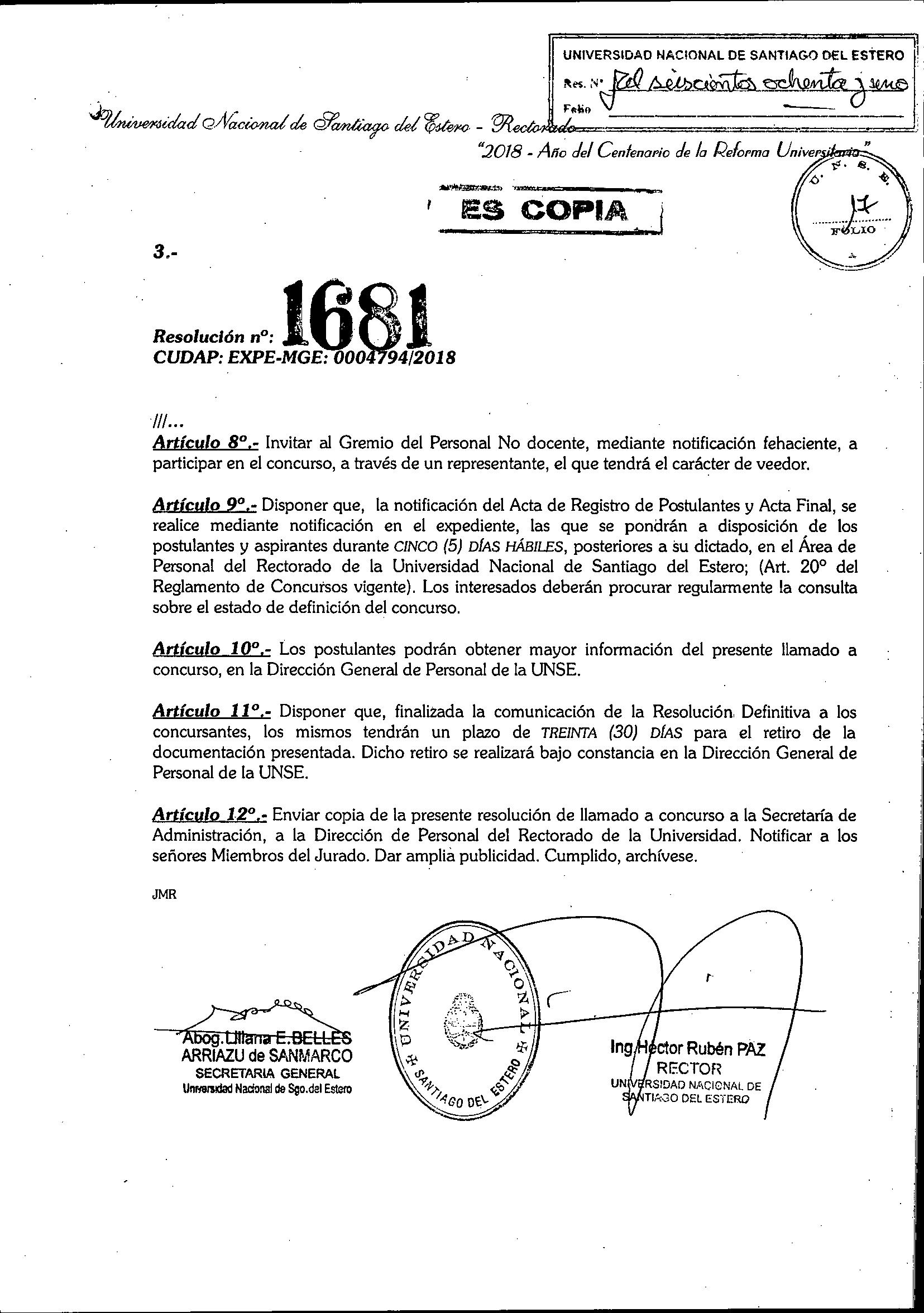 Resolución de Convocatoria de Concurso Nº1681/2018 Descargar desde Archivos adjuntos, debajo de esta publicación.